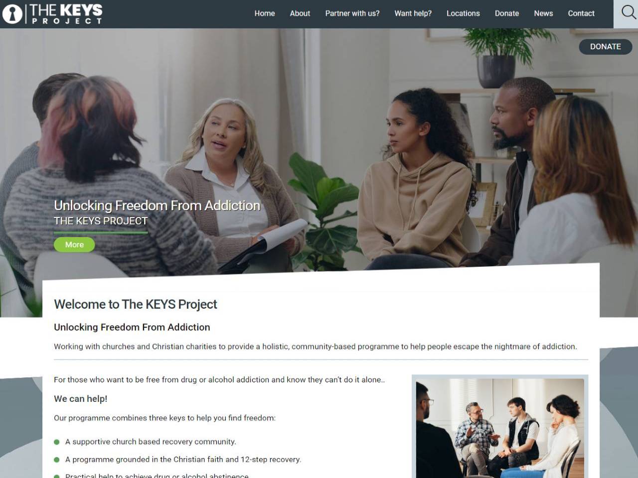 The KEYS Project offers a recovery programme built around three main elements, referred to as “keys.” The programme is designed to help people improve their lives physically, mentally, and spiritually. The Keys Project was set up by Dr Stephen Smith, a GP specialist in substance misuse, to coordinate a programme grounded in the Christian faith and 12-step recovery with practical help to achieve drug or alcohol abstinence.