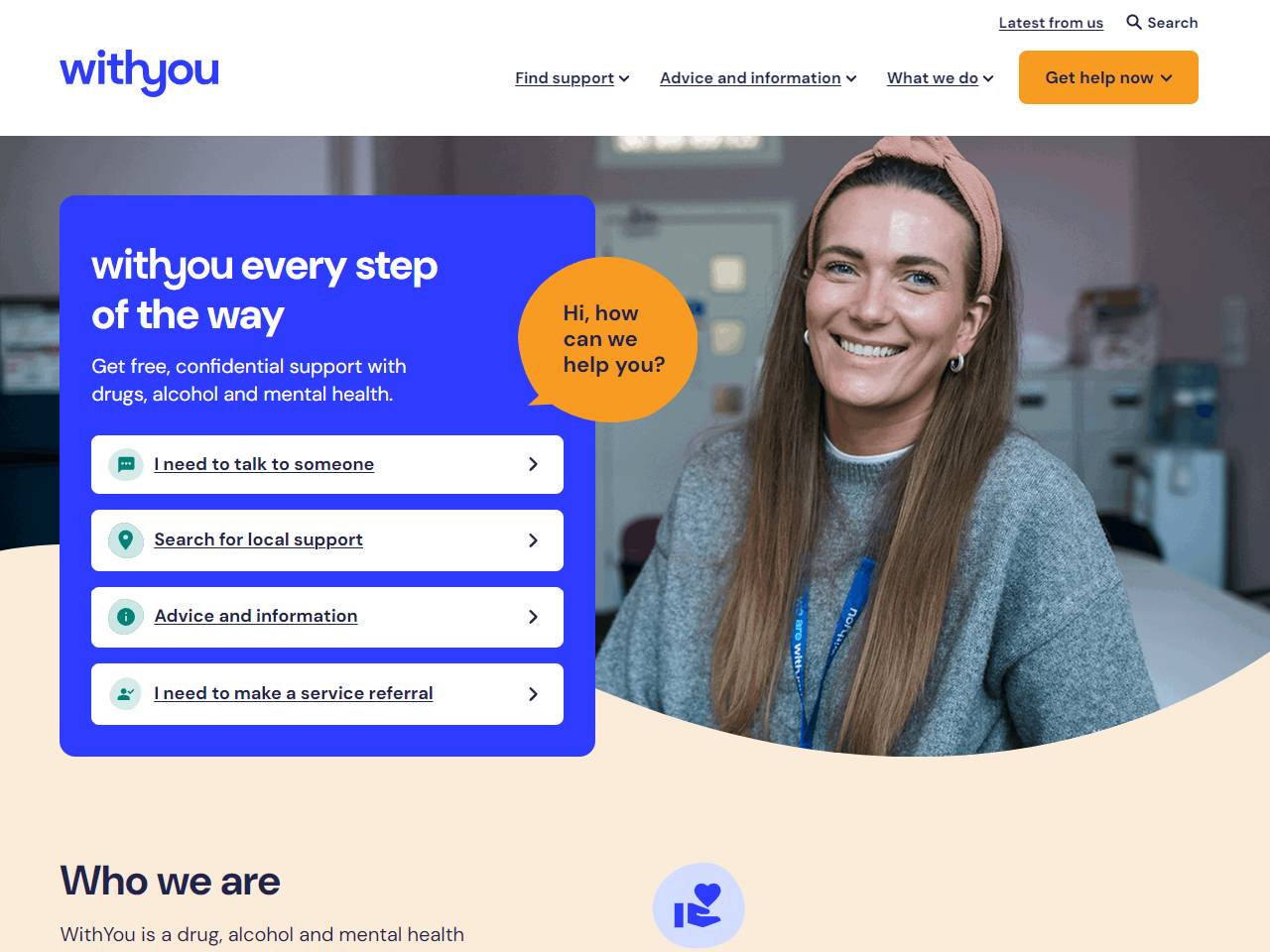 WithYou is a drug, alcohol, and mental health charity providing free and confidential support across England and Scotland. They offer over 80 services to help individuals and their loved ones with substance use and mental health challenges. Their mission is to create a non-judgmental environment where anyone can access support. They provide advice, information, and self-help resources on reducing or stopping substance use and improving mental well-being.